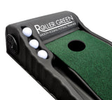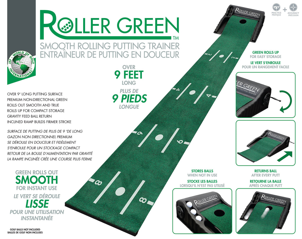 The Roller Green smooth rolling putting trainer from JEF World of Golf is the ultimate putting green made for portability. The self-contained roll-in, roll-out green is over 9 feet long and designed to lay flat from the very first putt to the last.