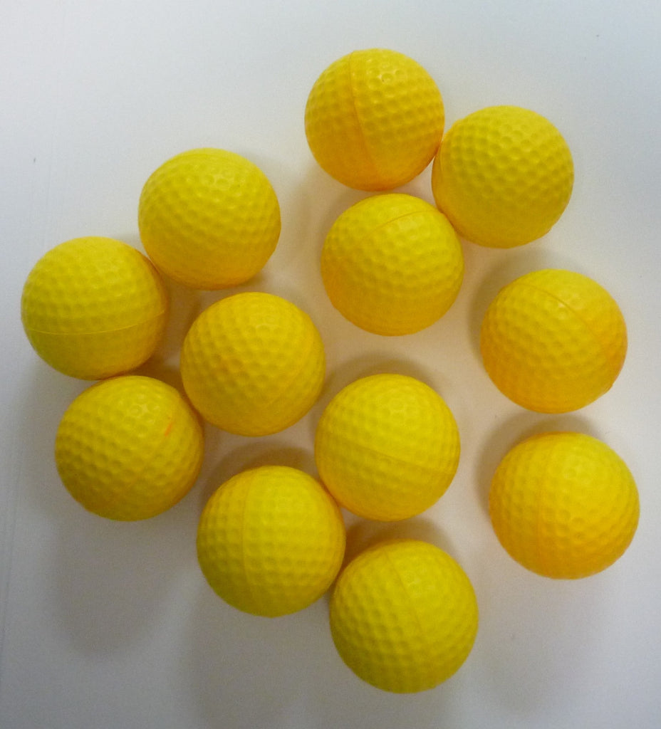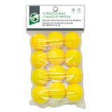 Set of 12 durable plastic practice balls with holes. These practice balls simulate the flight of a real golf ball.