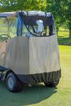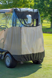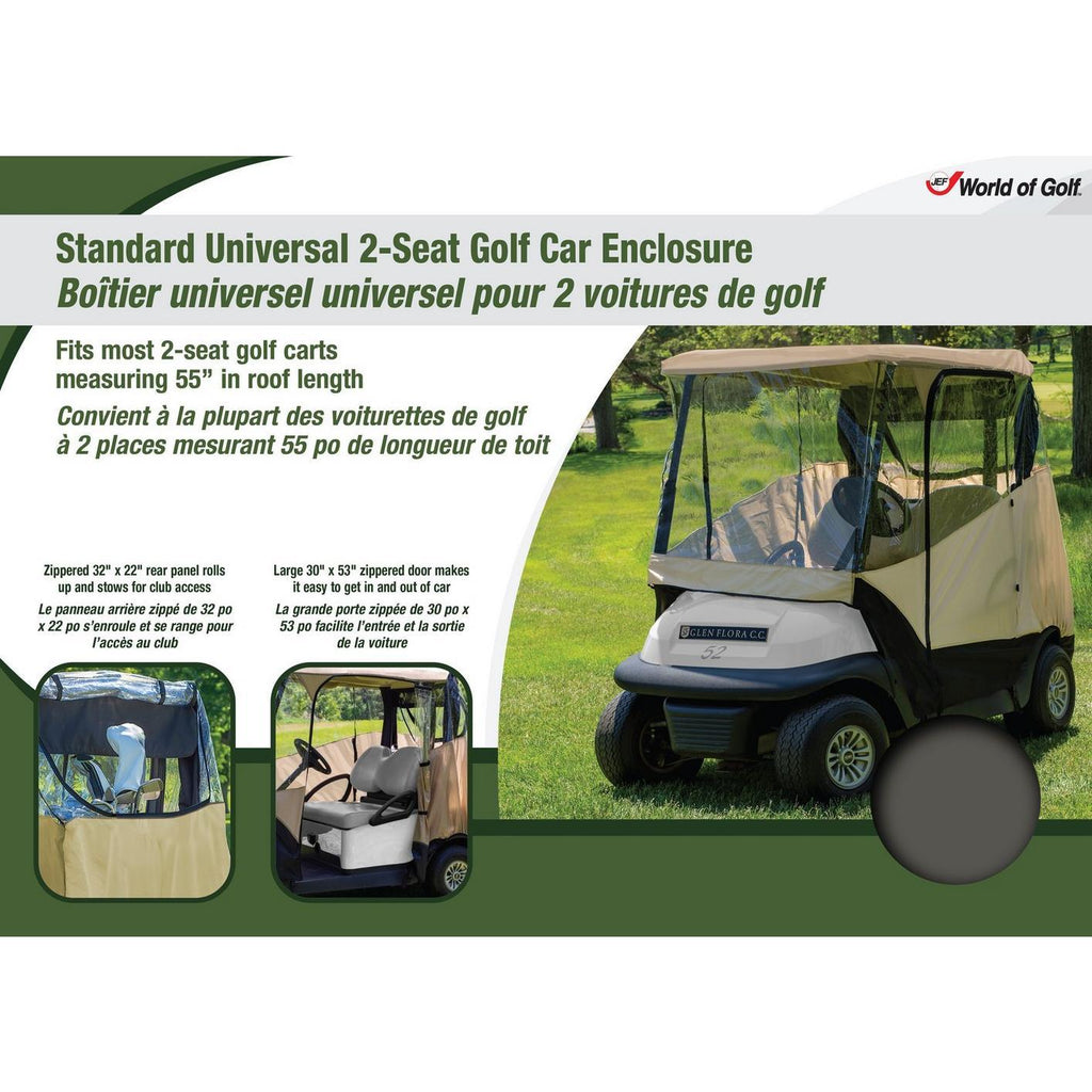 For any golfing enthusiast, a drivable golf cart enclosure is a necessity. The Standard Universal 2-Seat Golf Car Enclosure from JEF World of Golf allows you to play in comfort no matter what the weather conditions, protecting you from sun, wind, rain and cold. Driving a golf cart is operating a motor vehicle, and visibility is incredibly important. The Standard Universal 2-Seat Golf Car Enclosure features super-clear window material with weather-treated polyester walls and top. This enclosure fits over the roof and adjustable lock down "J" hooks secure the enclosure to golf car. Velcro straps on each side secure enclosure to front car frame. Durable two-way zippers with large pulls on the a 30" x 53" side panel lets you get in and out of the car easily. The 34" x 22" rear window zips open and can be rolled up for club access: simply unzip, grab a club, and zip back up again.