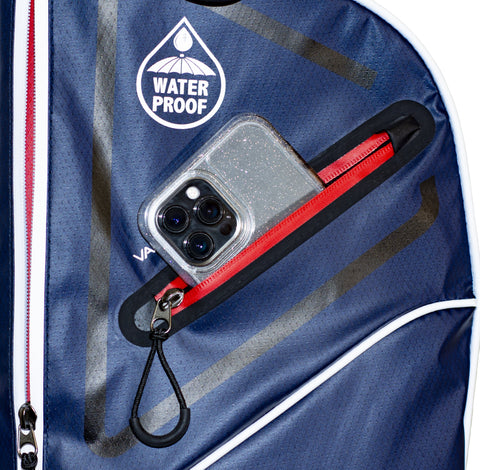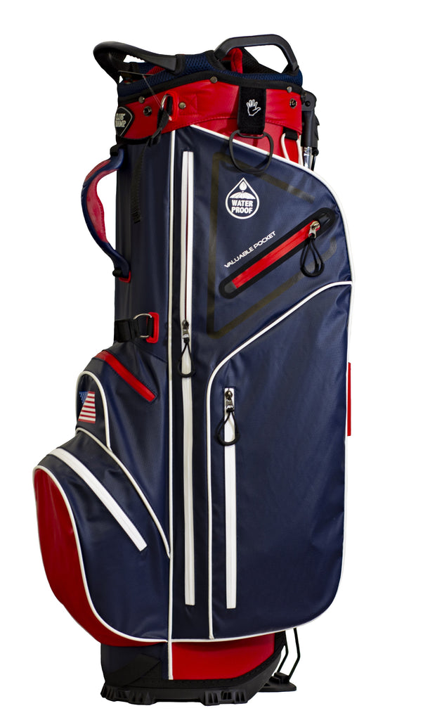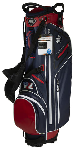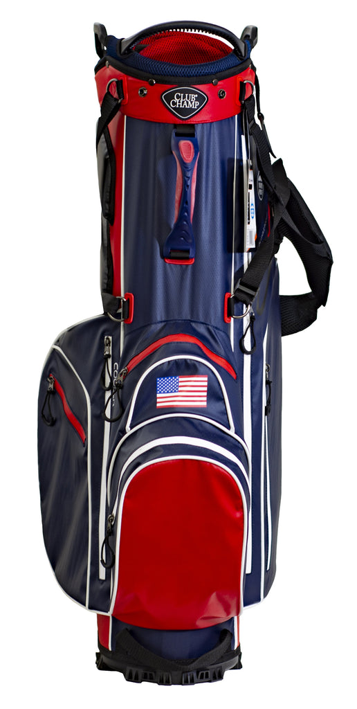 The Club Champ Waterproof Stand Bag features a 7-way padded top, waterproof materials, a padded comfort-grip handle, adjustable shoulder straps, a built-in cooler, plush valuables pockets, five easy-access pockets and a removeable rain hood.
