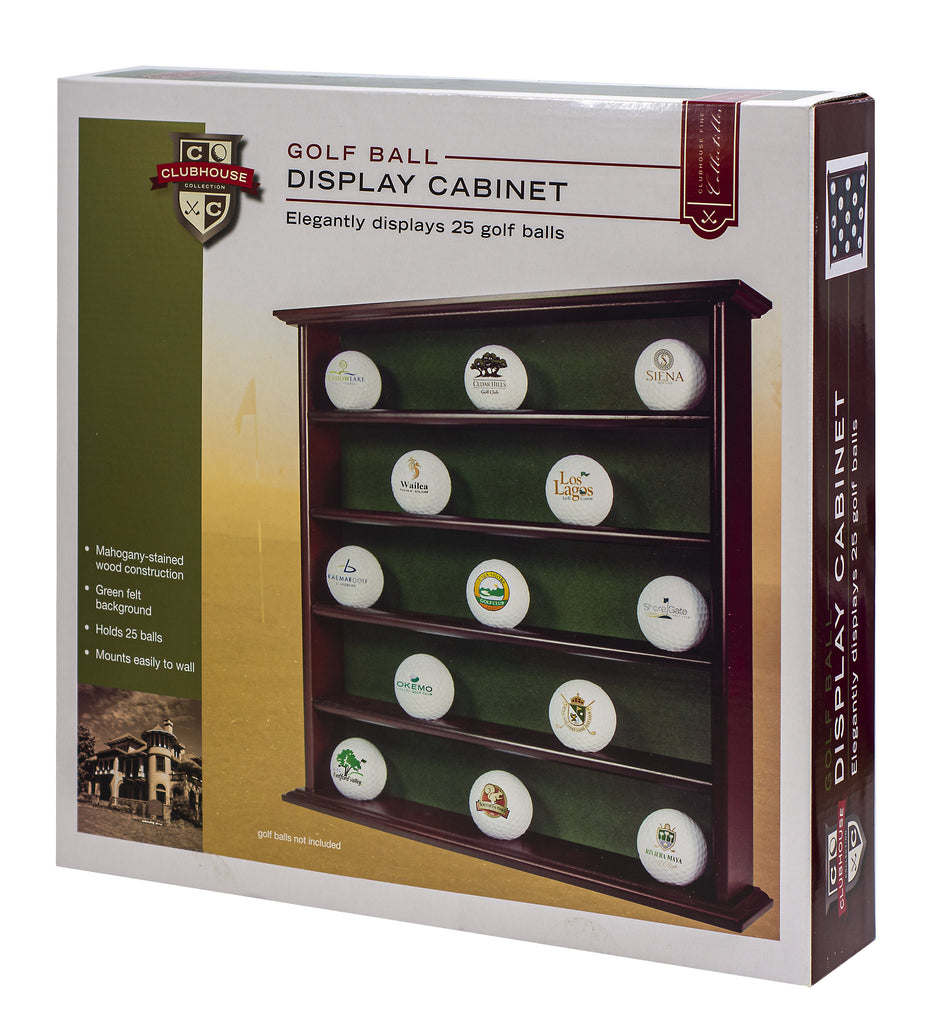 Ideal for any office, den, or family room, this elegant golf ball cabinet from Golf, Gifts & Gallery is perfect for displaying hole-in-one balls and other trophy keepsakes. The cabinet is made of high-quality mahogany-finished wood, with a green felt background offering a nice contrast to the balls' white color. In addition, users can locate the cabinet just about anywhere, as it mounts easily to a wall or sits on a table. Holding up to 25 balls at once, the cabinet carries a 90-day warranty.